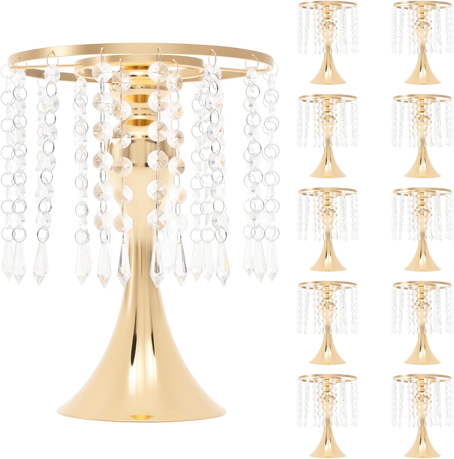 Details Dual-ring Design: It offers enhanced structural integrity, evenly distributing the weight of the hanging adornments. Conical-like Base: It not only provides excellent stability but also adds an elegant aesthetic. Application It is suitable for gardens, balconies, entryways, wedding venues, photo studios, etc. It can be used to place flower bouquets and other ornaments. Specification Material: Iron, Acrylic Process: Electroplating Color: Gold/Silver Style: Modern Shape: Round Assembly Required: Yes Mounting Type: Tabletop Number of Items: 10 Package Included: 10x Flower Stands, 1x English Diagram, Other Accessories for Assembly Small Each Flower Stand Height: 26cm/10.23in Base Diameter: 13cm/5.11in Top Diameter: 20cm/7.87in Package Size: 36x32x26cm/14.17x12.6x10.24in Gross Weight: 6.6kg/14.55lbs Net Weight: 6kg/13.23lbs Medium Each Flower Stand Height: 35cm/13.77in Base Diameter: 13cm/5.11in Top Diameter: 20cm/7.87in Package Size: 35x32x26cm/13.78x12.6x10.24in Gross Weight: 7.3kg/16.09lbs Net Weight: 6.94kg/15.3lbs Large Each Flower Stand Height: 54cm/21.3in Base Diameter: 17cm/7in Top Diameter: 20cm/7.9in Package Size: 42x42x34 cm/ 16.54x16.54x13.39 in Maximum Load: Approx. 8kg / 17.64lbs Gross Weight: 10.4 kg/ 22.93 lbs Net Weight: 7 kg/ 15.43 lbs Notes 1. Please check the product size carefully before purchasing. 2. Please note that the flowers or other decorations in the picture are not included in the package. 3. The crystal mentioned is only an appearance description of the product and is not made of crystal material. Please make sure that you don't mind before purchasing.