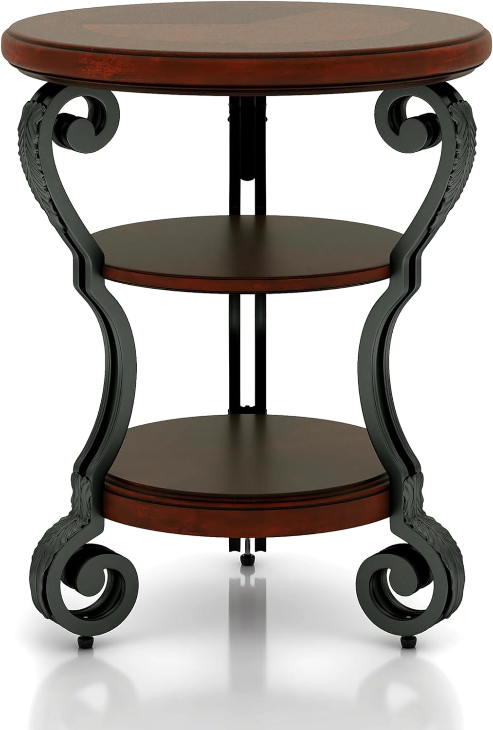 Traditional and elegant, this side table features a rich cherry finish. With ornate metal scroll details and open shelves, this piece works well in a living room to store books and decorative items.