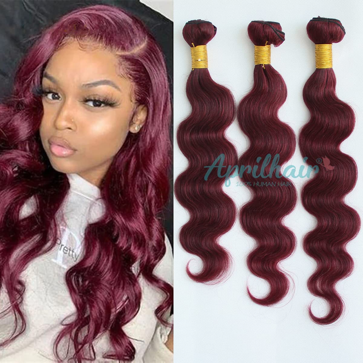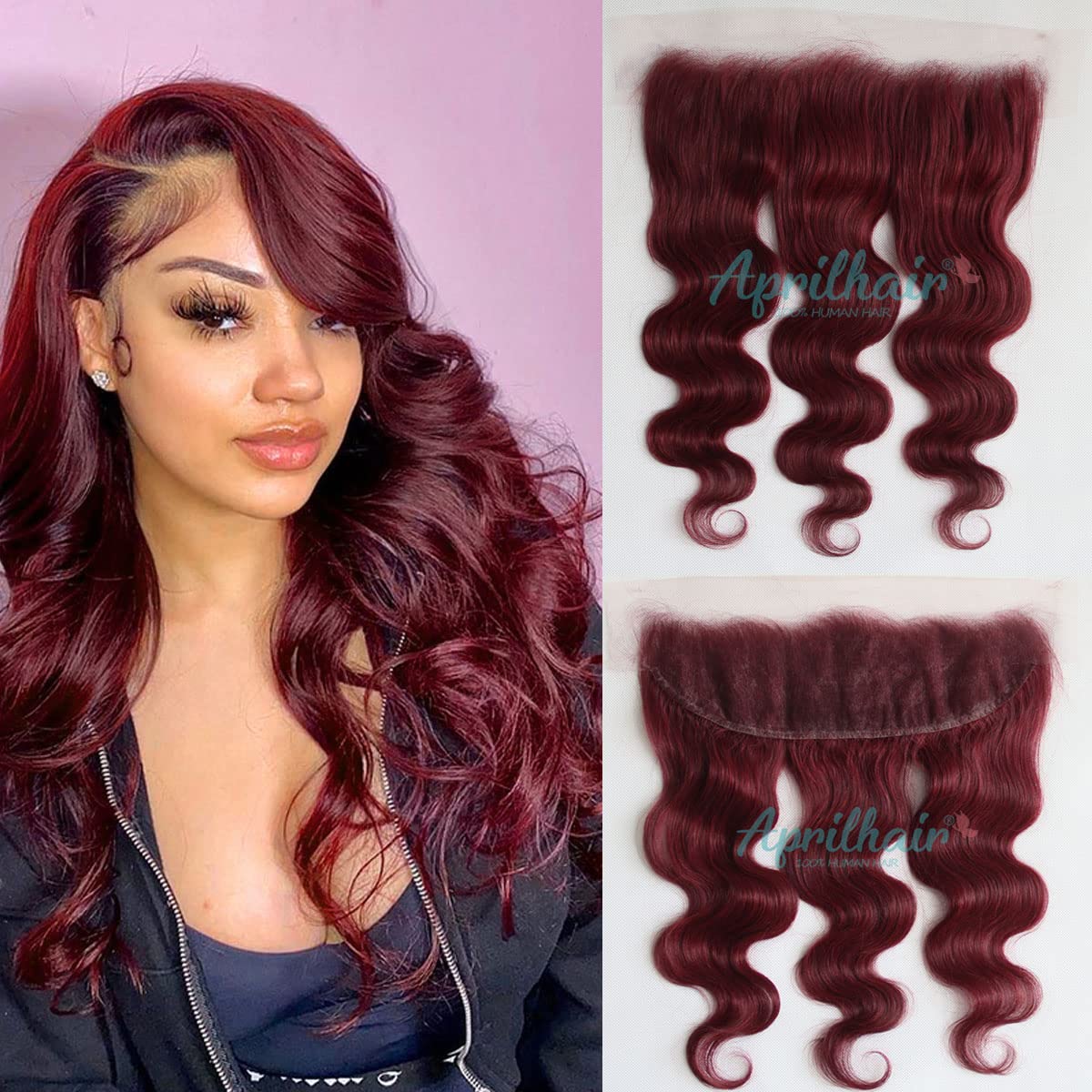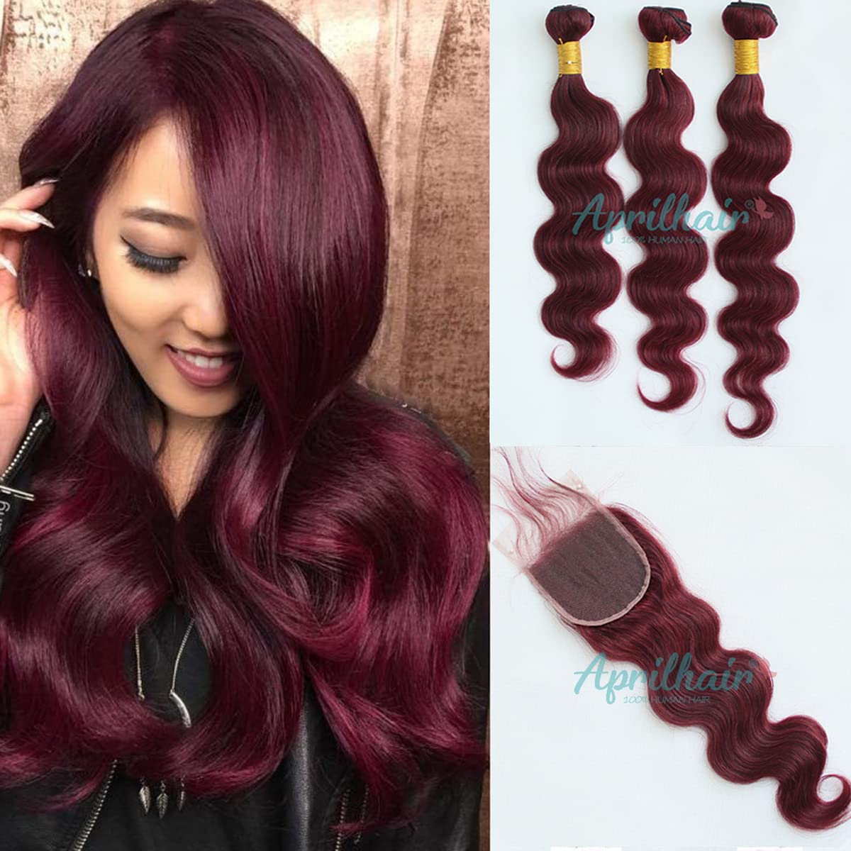 Hair Type:100% unprocessed Virgin Human Hair; Texture&Color:Brazilian Virgin Human Hair Body wave,#99j Extensions with Lace Frontal ; Hair Weight:Each bundle is 95-100g Lace Color:Medium Brown; Hair weft: Machine Double Weft Length:10-26 Inch About The Weft,10-20 Inch About Lace frontal; Hairstyles:For Beauty Women,For African American,For Black Women,For White Women; Quality Promise:Natural Hairline,Thick, Soft, No bad smell;Tangle & Shedding Free;Features Our Hair Extensions are premium quality human hair, very clean, natural ,soft, comb easily,there are no synthetic, no animal hair, we choose high quality hair which was cut off from young ladies directly, there is no chemical treatment.They can be easily Straightened, Curled, Dyed, Bleached and Styled by your favour!Aprilhair: We have a Factory History of More Than 17 Years, We Have Strict Quality Control and Skilled Workers.Best Service and Highest Quality Products to make you a happy shopping in our store!FAQ Q.How to make my hair no tangle and no shedding? A: 1. Our hair is hand made, please running the hair with wide tooth comb for straight, body wave, loose wave hair. For the curly hair, please use hand to grab your hair gently, don`t use any comb. 2. You should wash your hair with mild shampoo and conditioner weekly, don`t use hair dryer. 3. Also you can make a spry with mix of water and conditioner (ratio 2:1), spry it to do moisturizing everyday, more to the hair ends. It`s specially good for curly hair Q.Can I make style? A:As with your natural hair, do not use hot tools too often as it will dry the hair out. Q.For Full Head? A:Usually 3 bundles are enough to make a full head. If you like Thicker or need Longer hair, it's best to wear one more bundle. As the Longer the Length is, the Thinner the hair is.